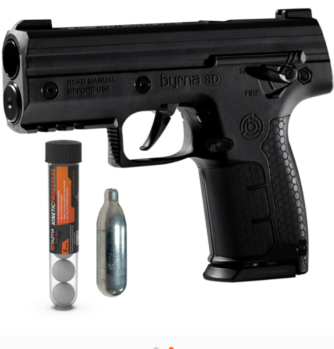 The Byrna SD (Self Defense) has been engineered for optimal performance. Powered by compressed air (CO2), the Byrna SD shoots .68 caliber round kinetic and/or chemical irritant projectiles that can disable a threat from up to 60-feet away. It is an incredibly powerful and non-lethal self-defense weapon.